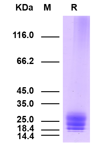 理論分子量為16.9kDa,由于糖基化,SDS-PAGE還原電泳分子量大小為25-30kDa。