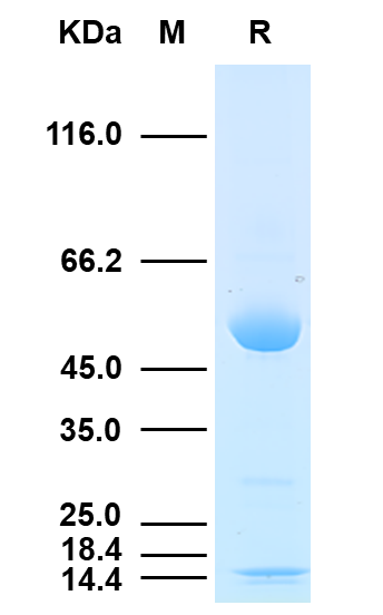 理論分子量為13.9kDa和59.3kDa,由于糖基化,SDS-PAGE還原電泳分子量大小為17kDa和65kDa。