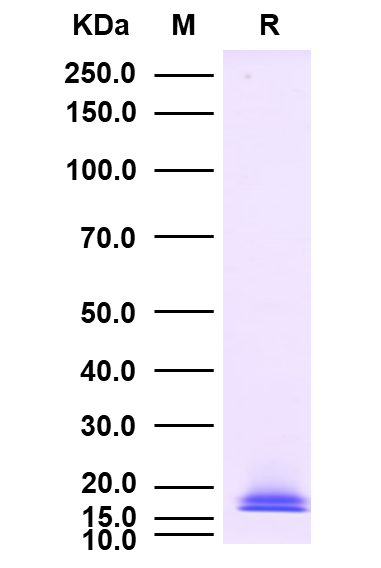 理論分子量為7.2kDa(部分α鏈)和8.2 kDa(部分β鏈),由于糖基化,SDS-PAGE還原電泳分子量大小為13-15 kDa(部分α鏈)和10kDa(部分β鏈)。